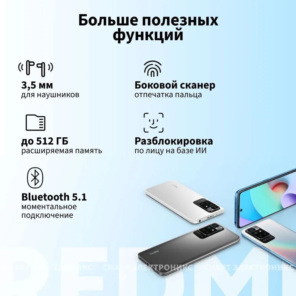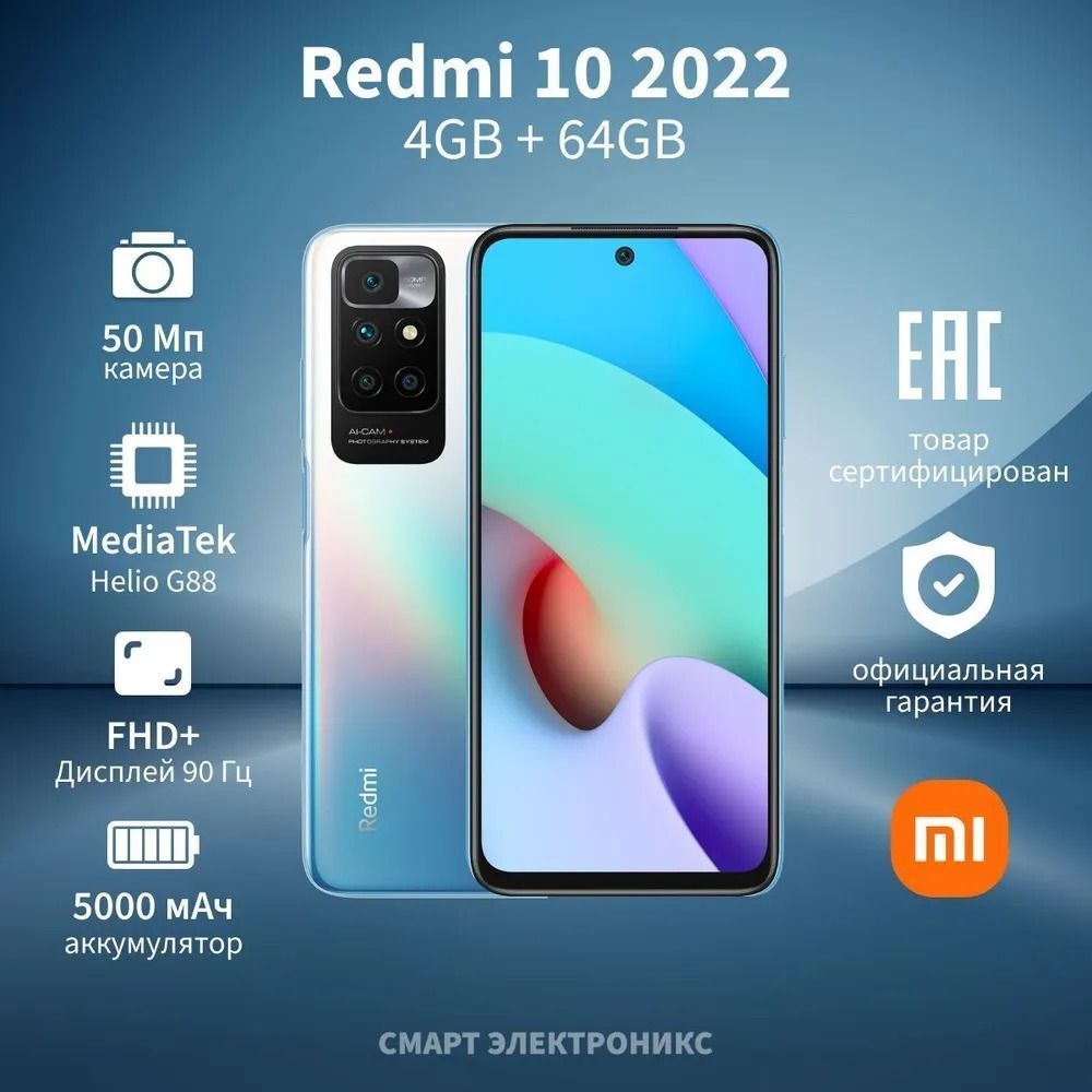 Смартфон Xiaomi Redmi 10 2022 – Уровень повышен!50-мегапиксельная четверная камера с искусственным интеллектом обеспечит высочайшее качество фото.Энергосберегающий режим AdaptiveSync, обычно доступный только во флагманских телефонах, автоматически сопоставляет частоту обновления с частотой кадров контента, обеспечивая более плавный результат и продлевая срок службы батареи.Наслаждайтесь лучшим звуком с двумя динамиками. Слушайте музыку с четким стереозвуком прямо с телефона.Мощный процессор MediaTek Helio G88 оптимизирован для обеспечения высокой производительности в играх с частотой 90 Гц, улучшенной обработки камеры и обеспечения быстрого и плавного отображения во всем, что вы делаете.Мощности большой батареи емкостью 5000 мАч достаточно, чтобы с легкостью продержаться целый день. Заряда хватит надолго: 30 часов звонков, 14 часов видео, 158 часов музыки.Заряжайте смартфон мгновенно с помощью быстрой зарядки 18 Вт или обратной проводной зарядки 9 Вт.