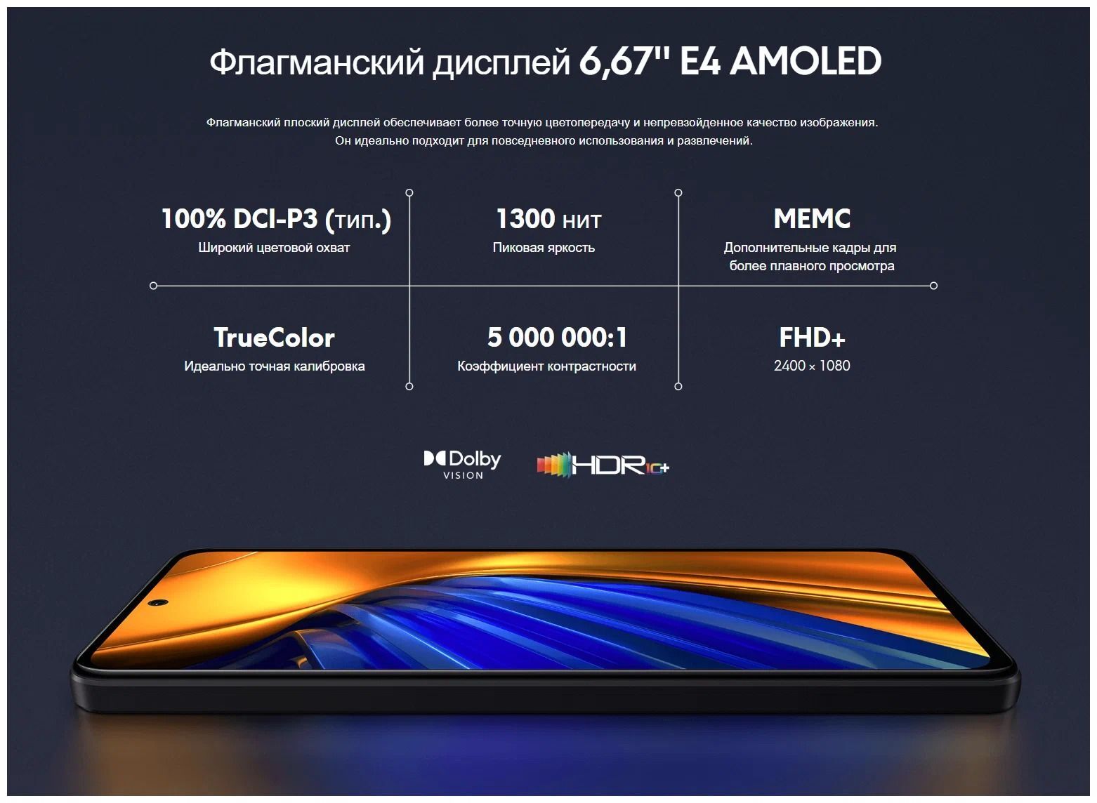 смартфон Xiaomi POCO F4, адаптер 67 Вт, кабель USB-C, инструмент для извлечения SIM-карты, защитный чехол, краткое руководство по началу работы, гарантийный талон, информация о технике безопасности, адаптер для наушников Type-C–3,5 мм