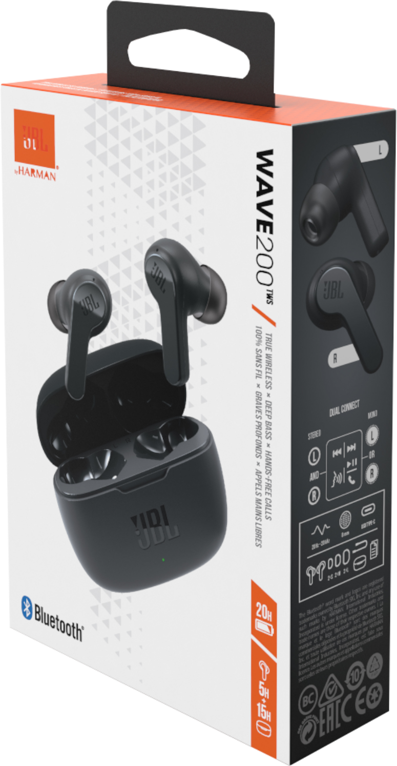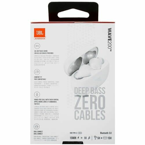 Технология JBL Deep Bass Sound С JBL музыка лучше. И ваш день тоже. Прочувствуйте звук с глубокими басами и сделайте свой день ярче благодаря 8ми мм излучателям. Общее время воспроизведения 20 часов Заряда наушников хватает на 5 часов и еще 15 часов в чехле. С JBL Wave 200TWS вы сможете веселиться до упада. Любой наушник или сразу оба Теперь вы можете принимать звонки или слушать музыку с любого наушника (или обоих) благодаря технологии независимого подключения. Выберите наушник, а другой оставьте в чехле, чтобы он не разрядился. Техническое описаниеТип: наушникиВид наушников: ВнутриканальныеФункциональные возможности: Голосовые подсказки, Прием/сброс вызова, Регулировка громкости, Управление воспроизведениемДиапазон частот: 20 - 20000 ГцЧувствительность: при 1 кГц, 1 мВт (дБ) 108Импеданс: 16 ОмНаличие микрофона: ДаВес: 17.4 гДиаметр мембраны: 8 ммВремя работы в режиме прослушивания музыки до: 5 чВремя полного заряда, около: 2 чРазъемы: USB Type-CБеспроводное соединение: BluetoothBluetooth: 5.0Поддержка кодеков: SBCПрофили Bluetooth: A2DP, Audio / Video Remote Control Profile (AVRCP), Hands-Free Profile (HFP), Headset Profile (HSP)Особенности: вес чехла с функцией зарядки 39.3 гКомплектацияНаушникиЗарядный кейсКабель USBСменные амбушюры - 2 парыИнструкция