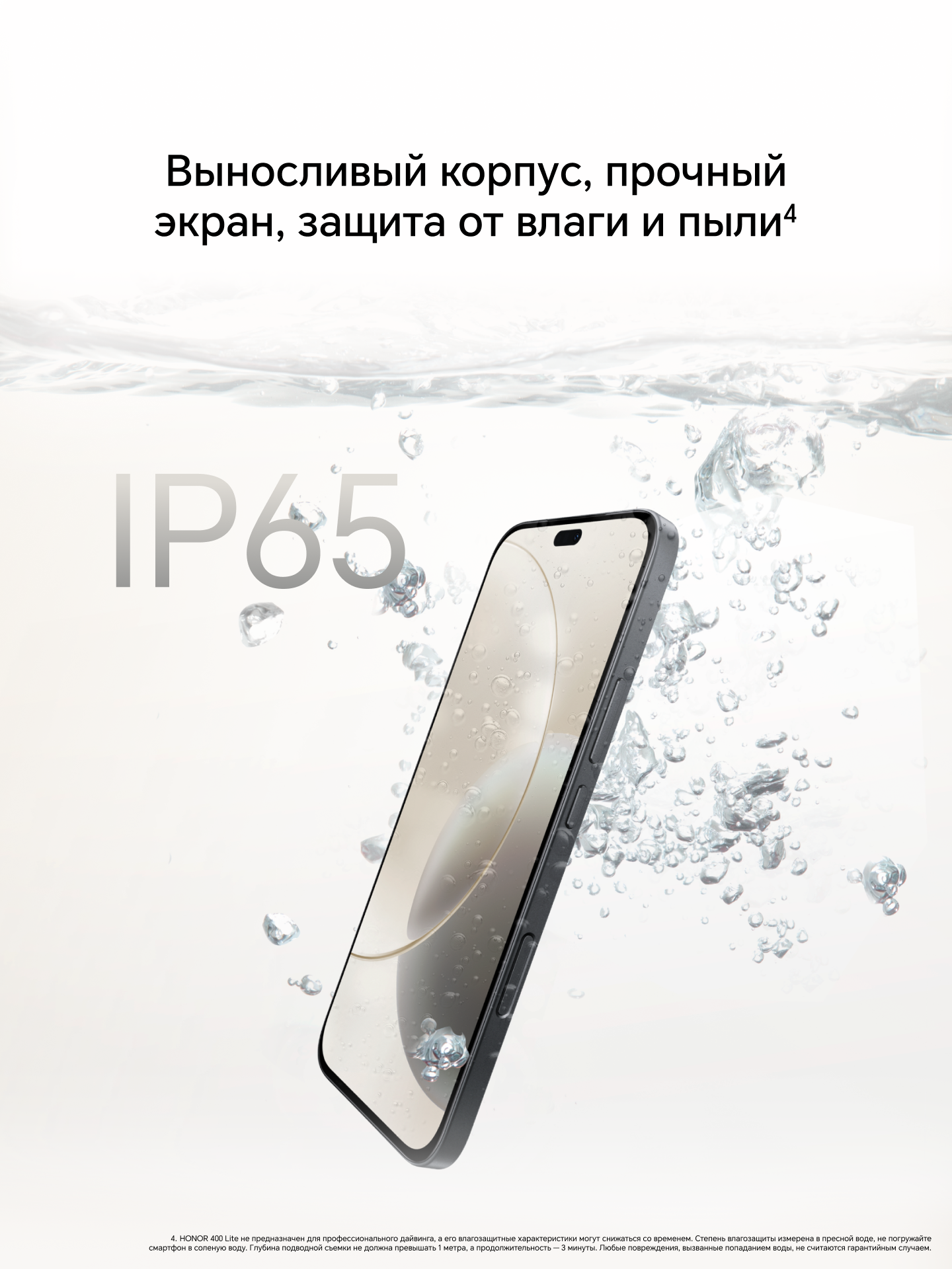HONOR 400 Lite с минималистичным дизайном и геометричными формами модуля основной камеры представлен в трех современных цветах: вельветовый серый, вельветовый черный и вельветовый бирюзовый. Благодаря эксимерной лазерной обработке задняя панель смартфона получила красивую матовую поверхность без бликов с бархатистой текстурой. HONOR 400 Lite весит всего 171 г при толщине корпуса 7,29 мм. Он легкий и удобно лежит в руке. Смартфон надежно защищен от повреждений при падениях во время повседневного использования, что подтверждает сертификат 5 звезд от компании SGS. Поддержка управления мокрыми руками и степень защиты от пыли и воды IP65 позволяют пользоваться им даже во влажной среде.