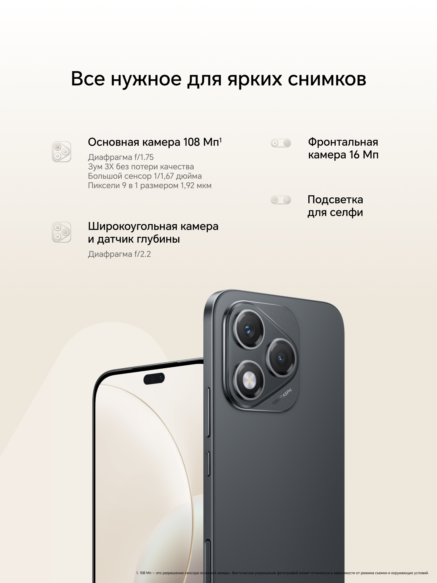 HONOR 400 Lite оснащен основной камерой с разрешением 108 Мп и светосильной оптикой (f/1,75), а также широкоугольной камерой 5 Мп с датчиком глубины. Двойная камера снимает повседневные сюжеты с высоким качеством и детализацией, воспроизводит естественный эффект боке и поддерживает три режима портретной съемки: атмосферный портрет (1x), классический портрет (2x) и портрет крупным планом (3x).