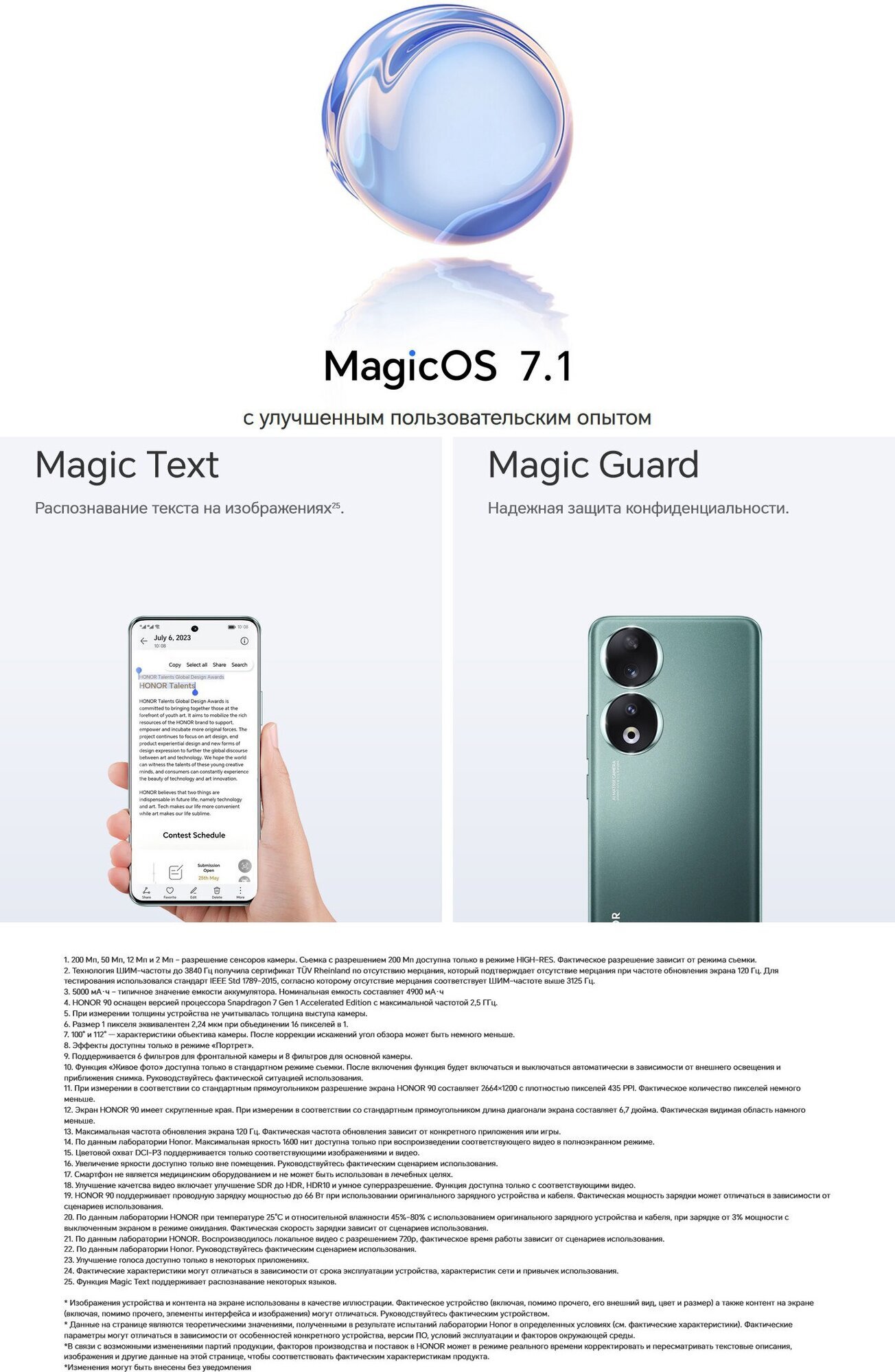 Поделитесь своими впечатлениями Сверхчистая камера на 200 Мп. 200-мегапиксельная основная камера и 50-мегапиксельная селфи-камера. Движок обработки изображений Honor Главная гордость смартфона — передовая система камер. Основной модуль получил разрешение 200 Мп с диафрагмой F/1.9. Для красивого эффекта размытия заднего фона предусмотрен сенсор глубины. Ультраширокоугольная камера с углом обзора 112 градусов также может снимать в макрорежиме. Дисплей с защитой глаз Экран не мерцает, есть поддержка технологии динамического изменения яркости, специальный ночной режим синхронизируется с циркадными ритмами человека, вредное синее свечение снижено на аппаратном уровне, яркость автоматически регулируется. Простота в роскоши Вдохновленная ювелирными изделиями высокой моды. Высокая производительность Аккумулятор с высокой плотностью энергии 5000 мАч3. Система привода охлаждения во всех зонах. Snapdragon 7 Gen 1 ускоренная версия. MagicOS 7.1. " HONOR 90 превосходит ожидания смартфона по его ценовой категории. Несмотря на то, что она удобно позиционируется на рынке среднего класса, в ней есть функции, которые мы привыкли видеть во флагманских моделях, и главная из них - яркий и четкий AMOLED-экран с разрешением 6,7 дюйма и частотой 120 Гц " Рекомендована ведущими мировыми СМИ Вдохновленные ювелирным дизайном, перекрещивающиеся линии драгоценных камней образовали изысканный лабиринт, улавливающий свет для игры света и тени. Дизайн кольца камеры в виде фазы Луны, обеспечивает вечную динамику в статичном состоянии, запечатлевая мимолетные моменты с помощью света и тени. Изогнутый дисплей с разрешением 1.5K и диагональю 6.7 дюйма идеально подходит для игр и просмотра контента. Контрастность 5 000 000:1 позволила достичь глубокого черного и яркого белого цветов. Смартфон получил динамическую частоту обновления с максимальной частотой 120 Гц для плавности анимации и переходов. Пиковая яркость экрана достигает 1 600 нит. Умные алгоритмы автоматически улучшают качество видео с низким разрешением. В меру тонкий и легкий. Благодаря совершенно новому подвесному процессу установки с четырехугольным изгибом, вес телефона составляет 183 г, а толщина - 7,8 мм, что делает его максимально удобным для вашей руки. Сверхчистые изображения с разрешением до 200 Мп запечатлевают миллионы особенных моментов. Продемонстрируйте яркую ночь, будь то в неоновом городе или на затемненном уголке улицы. Запечатлейте грандиозную сцену с помощью Wide, а мелкие забавные моменты - с помощью Macro. 12-мегапиксельная сверхширокая камера для макросъемки, с великолепными сценами и небольшими бликами. Великолепная картинка даже при съемке с подсветкой. Благодаря превосходному HDR камеры справляются с задачей подсветки. Движок обработки изображений HONOR HONOR 90 реконструирует процесс обработки портрета в формате RAW. Благодаря добавленному модулю улучшения тональности он оптимизирует качество изображения и стиль портретов на основе RAW-домена, подчеркивая каждую деталь и позволяя цветам оживать. Портретная съемка с несколькими фокусами. Великолепна на каждом фото. 1x широкая перспектива Сбалансированная композиция между объектами съемки и окружающей средой. 2x формат Запечатлевайте то, что вы видите, в более ближнем ракурсе Портретный фильтр собственной разработки HONOR.9 Стиль постоянно меняется и динамичен. Созда