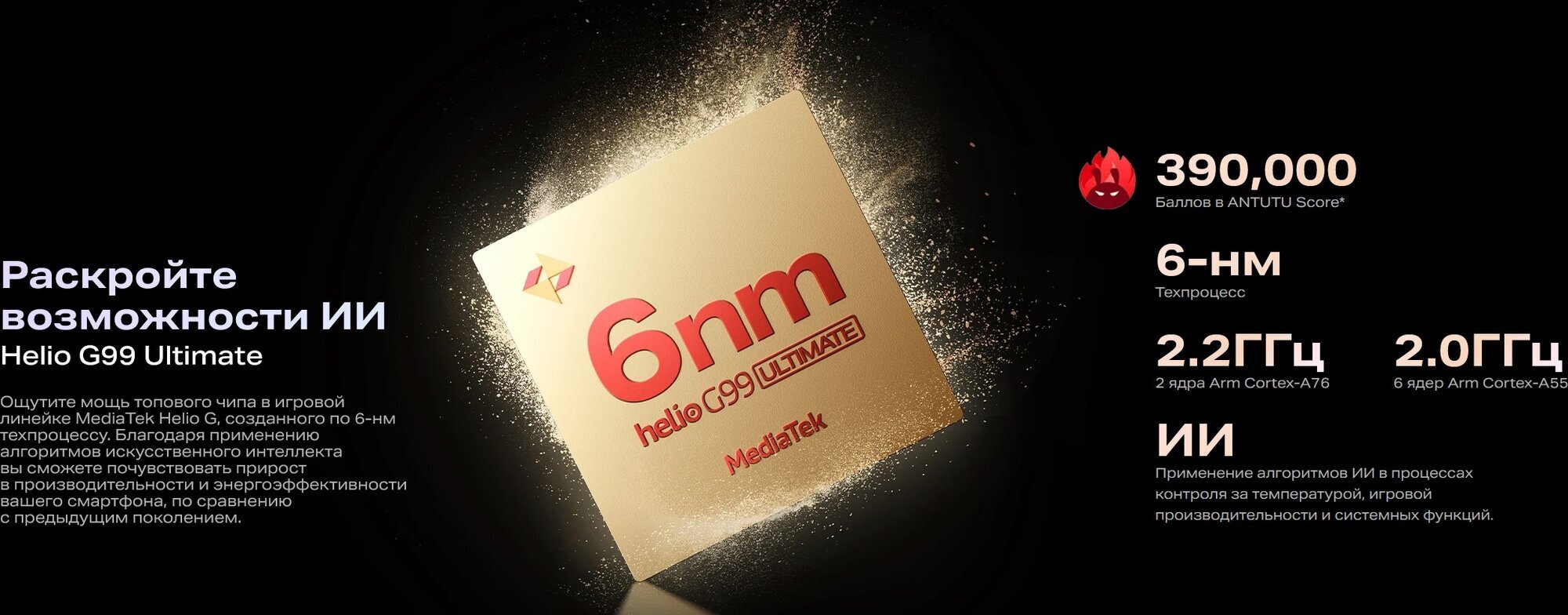 Телефон работает на базе операционной системы Android 14 и оснащен процессором Helio G99 с 8 ядрами и частотой 2,2 ГГц. Это обеспечивает высокую производительность и энергоэффективность.