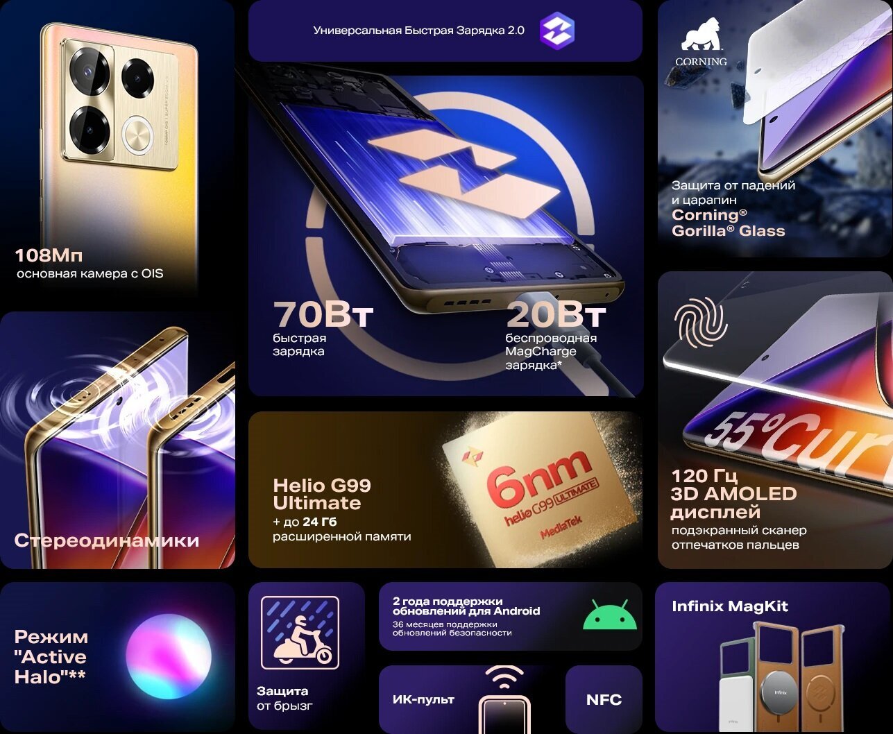 Гаджет работает на базе операционной системы Android 14 и оснащен процессором Helio G99 с 8 ядрами и частотой 2.2 ГГц. Это обеспечивает высокую производительность и энергоэффективность, а также поддержку искусственного интеллекта.
