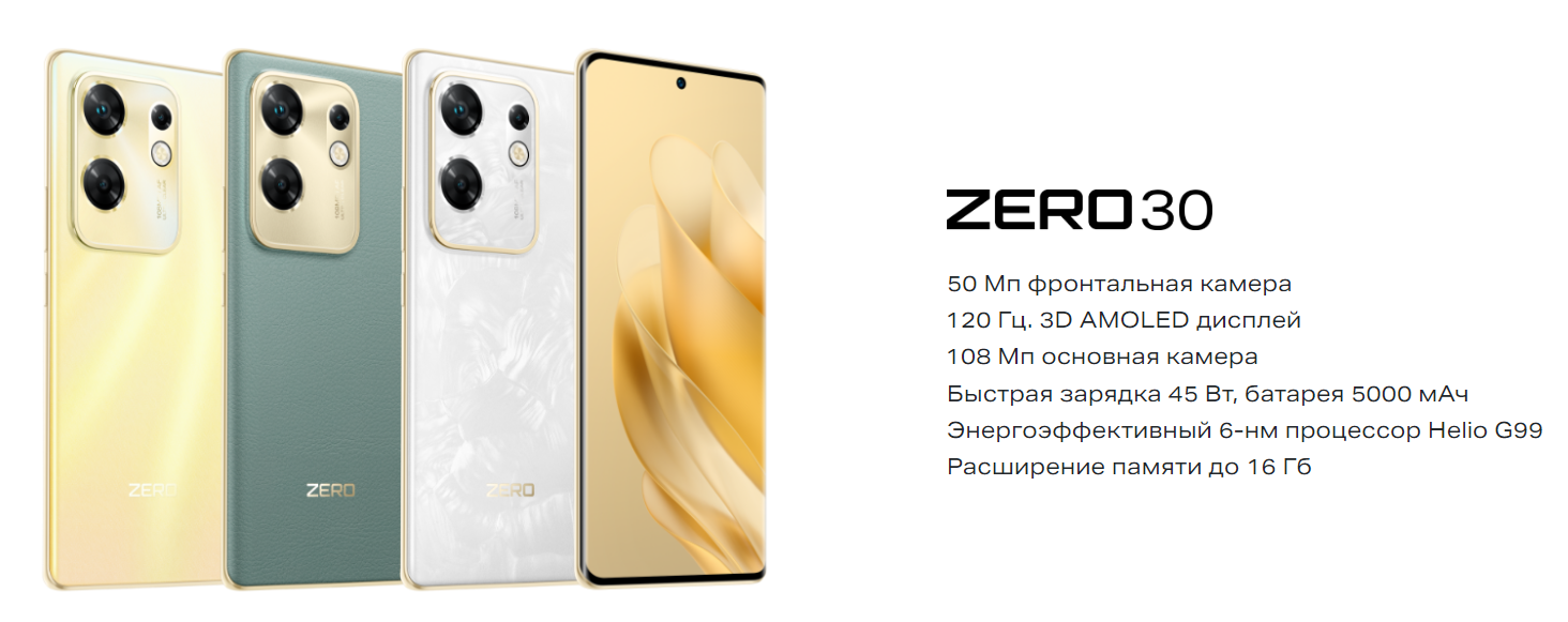 Общая информацияДата выхода на рынок2023 г. Информация? Функциональные элементы стандартны, за исключением некоторых особенностей, таких как маленькая и плоская клавиша питания (сканер отпечатков встроен в дисплей) и отсутствие мини-джека. ? Корпус защищен по стандарту IP54, что обеспечивает некоторую влагозащиту и защиту от дождя. ? Экран защищен закаленным стеклом Gorilla Glass 5, обеспечивая высокий уровень защиты. ? Фронтальная камера расположена в индивидуальном отверстии, окруженном темной панелью, и также отображает значки входящего звонка и зарядки смартфона. ? Infinix ZERO 30 4G работает на Android 13 с оболочкой XOS 13, которая постепенно улучшается и становится более опрятной. ? Дисплей AMOLED с диагональю 6,78 дюйма и разрешением 2400 ? 1080 точек обеспечивает четкое и яркое изображение. ? Поддерживается повышенная частота обновления экрана до 120 Гц, а также частота широтно-импульсной модуляции (ШИМ) 1920 Гц, что делает мерцание экрана практически незаметным. ? В отличие от моделей NOTE 30 VIP и GT 10 Pro, аппаратная платформа Infinix ZERO 30 4G оснащена чипсетом MediaTek Helio G99, который является популярным в среднем ценовом сегменте. ? Встроенные беспроводные модули включают двухдиапазонный Wi-Fi, Bluetooth 5.2, спутниковую навигацию и NFC. ? Камера Infinix ZERO 30 4G состоит из трех модулей, включая главный 108-мегапиксельный модуль и два вспомогательных двухмегапиксельных модуля для макросъемки и создания эффекта размытия заднего плана. Описание ОсновныеТипсмартфонСостояние устройствановыйОперационная системаAndroidВерсия ОС на момент выходаAndroid 13 (XOS 13)Android без оболочкиНетРазмер экрана6.78"Разрешение экрана1080x2400Технология экранаAMOLEDЧастота обновления экрана120 ГцОперативная память8 ГБ (LPDDR4X)Встроенная память256 ГБ (UFS 2.2)Количество точек матрицы108 МпХарактеристики камеры108 Мп, f/1.75, 1/1.67", широкоугольный 2 Мп, f/2.4, макро 2 Мп, f/2.4, датчик глубиныМаксимальное разрешение видео3840x2160 (60 кадров/с)Беспроводная зарядкаНетБыстрая зарядкаДаПоддержка карт памятиНетКоличество физических SIM-карт2 ПроцессорПлатформаMediatekПроцессорMediatek Helio G99Тактовая частота процессора2 200 МГцКоличество ядер8 (2+6)Микроархитектура ЦПУARM Cortex-A76 2200 МГц + Cortex-A55 2000 МГцРазрядность процессора64 битаТехпроцесс6 нмГрафический ускорительMali-G57 MC2 КонструкцияКонструкция корпусамоноблокСменные панелиНетМатериал корпусапластикМатериал задней крышкистеклоЦвет корпусабелыйЦвет фронтальной панеличерныйУдаропрочный корпусНетПыле- и влагозащитаДа IP54Физическая QWERTY-клавиатураНетРасположение фронтальной камерыв экранеРасположение сканера отпечатка пальцавстроен в дисплейКнопка SOSНетФормат SIM-картыnano-SIM Размеры и весДлина164.52 ммШирина75 ммТолщина7.9 ммВес182 г ЭкранКоличество цветов экрана1.073 млрдРазрешающая способность экрана388 ppiСоотношение сторон20:9Сенсорный экранДаЗащита от царапинДа Gorilla Glass v5Постоянная работа экранаНет Основная камераВстроенная камераДаКоличество основных камер3Дополнительные модули камерыширокоугольный, макро, датчик глубиныВстроенная вспышкаДаАвтоматическая фокусировкаДаОптическая стабилизацияДаДиафрагма основной камерыf/1.75Максимальное количество кадров в секунду60 кадров/с Фронтальная камераФронтальная камераДа 50 МпДвойная камераНетАвтоматическая фокусировкаНетОптическая стабилизацияНетВстроенная вспышкаНетДиафрагмаf/2.45Максимальное разрешение видео3840x2160 (4K UHD) ФункцииСветодиодный индикато