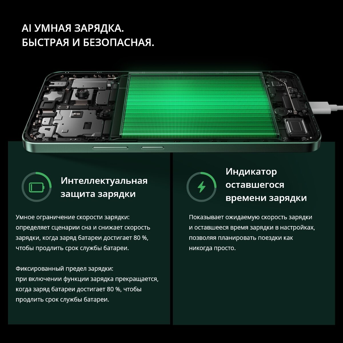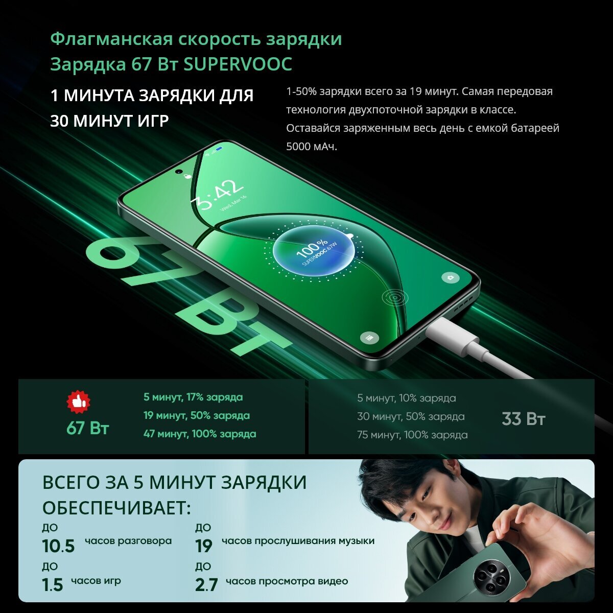 Сотовый поддерживает зарядку SUPERVOOC мощностью 45 Вт, что позволяет за полчаса зарядиться на 50%.