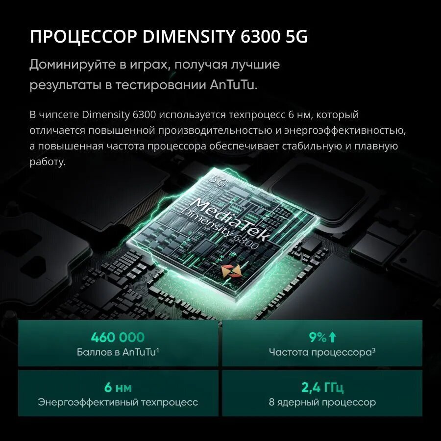 Мобильный Realme 13 5G оснащен 256 ГБ встроенной памяти, что позволяет хранить большое количество фотографий, видео, музыки и других файлов.