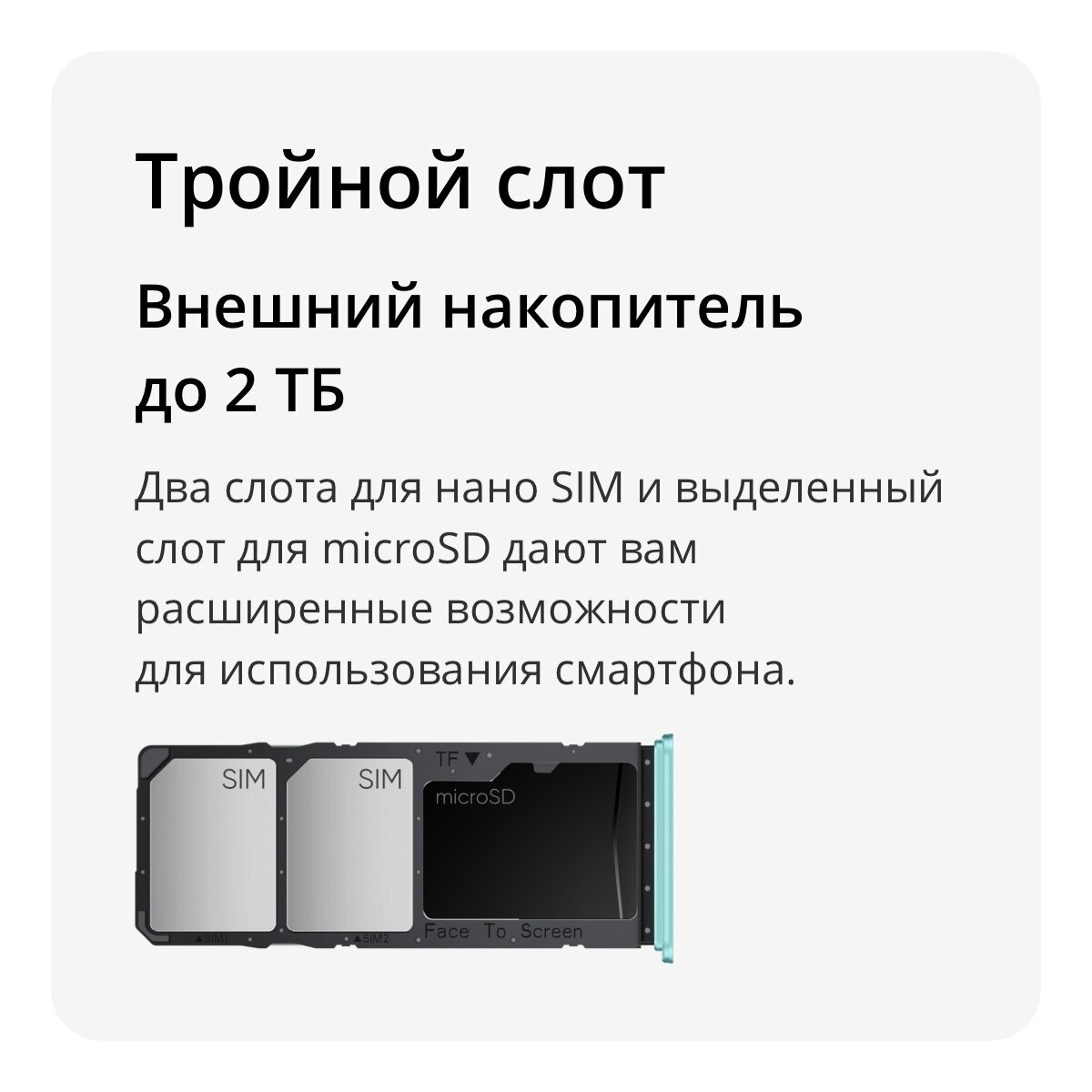 Тип матрицы экрана: IPS LCD Сенсорный экран: Да Количество цветов экрана: 16.7 млн. Тип сенсорного экрана: емкостный Мультитач: да Диагональ экрана: 6.74 " Разрешение экрана: 1600 x 720 Плотность точек: 262 ppi Яркость: 450 кд/м2 Частота обновления экрана: 90 Гц Система Платформа: Android Операционная система: Android 13 Память Объем встроенной памяти: 128 Гб Объем оперативной памяти: 4 Гб Тип оперативной памяти: LPDDR4X Слот для карты памяти: Да Тип карты памяти: microSD (TransFlash) Максимальный объем карты памяти: 2 Тб Камера Камера: Да, двойная Разрешение основной камеры: 50 Мп Разрешение второй основной камеры: 0.08 Мп Диафрагма основной камеры: F/1.8 Диафрагма второй камеры: F/3.0 Фронтальная камера: Да Разрешение фронтальной камеры: 5 Мп Диафрагма фронтальной камеры: F/2.2 Запись видеоклипов: Да Встроенная вспышка: Да Тип вспышки: Светодиодная Функции камеры: Time lapse, Автофокусировка, Замедленная съемка, Искусственный интеллект (ИИ), Панорамная съёмка, Портретный режим, Профессиональный, Распознавание лица, Съемка HDR-фото, Съемка в условиях недостаточной освещенности, Эффект боке Особенности камеры Основаня камера: модуль S5KJN1SQ03 50 Мп, f/1.8 , 5P + ЧБ модуль портретный 0.08 Мп, f/3.0 1P. Фильтр «Городская улица», Фильтр «Секретный сад», Фильтр «Летние каникулы». AI Сцена, Фильтры Фронтальная камера: 5 Мп. Режимы: Видео, Портрет, Бьюти , HDR, Определение лиц, Фильтры, Эффект боке. Процессор Процессор: Unisoc T612 Архитектура процессора: 12 нм. 2 x Cortex A75 1.82 ГГц + 6 x Cortex A55 1.82 ГГц Количество ядер: 8 Максимальная частота процессора: 1.82 ГГц Видеоконтроллер: Mali-G57 Мультимедиа Мультимедийные возможности: Аудиоплеер, Видеоплеер Датчики Основные датчики: Датчик освещённости, Датчик отпечатка пальцев, Датчик приближения Дополнительные датчики: Акселерометр, Компас Связь Стандарты сотовой связи: 2G, 3G, 4G LTE, GSM VoLTE: Да Диапазоны GSM: 1800, 1900, 850, 900 Диапазоны 3G (UMTS): 1800, 1900, 2100, 850, 900 Диапазоны LTE: LTE FDD: B1/2/3/4/5/7/8/19/20/28. LTE TD: B34/38/39/40/41. Интернет: 4G LTE, EDGE, GPRS, HSDPA+, WCDMA Количество SIM-карт: 2 Тип SIM-карты: nano Соединение Беспроводное соединение: Bluetooth, NFC, Wi-Fi Wi-Fi: 802.11b, 2.4 ГГц / 5 ГГц, 802.11a, 802.11ac, 802.11g, 802.11n Bluetooth: 5.0 Проводное соединение: USB Type-C Разъем для наушников: 3,5 мм Навигация Навигация: A-GPS, GALILEO, GPS, ГЛОНАСС Корпус Высота: 167.16 мм Ширина: 76.67 мм Толщина: 7.99 мм Вес: 186 г Питание Аккумулятор: Несъемный Тип аккумулятора: Li-Pol Емкость аккумулятора: 5000 mAh Время в режиме ожидания до: 38 ч Время в режиме разговора в сети 2G до: 36 ч Время полного заряда, около: 85 мин Функции зарядки и энергопотребления: Быстрая зарядка Особенности элетропитания: Быстрая зарядка 33Вт Комплектация Смартфон Кабель USB Сетевой адаптер Ключ для извлечения SIM Инструкция