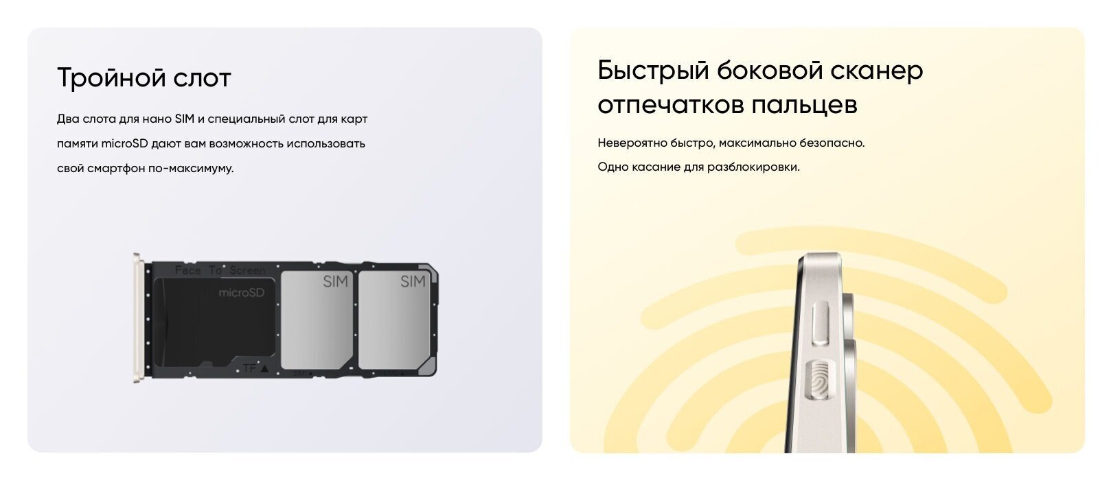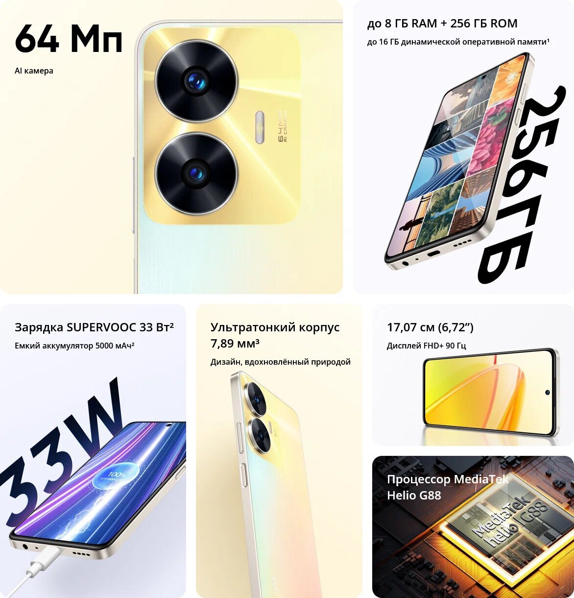 Передовая камера Первая в своем сегменте 64-мегапиксельная камера с самым большим сенсором и передовым программным обеспечением для высококачественной обработки изображений. Потрясающая камера для первоклассных снимков. Сочные снимки В режиме 64 МП значительно повышается четкость, что придает дополнительную текстуру и глубину самым важным снимкам. Встречайте флагманский уровень обработки фотографий Цифровая стабилизация для четких снимков. Четкие снимки, даже во время движения. Цифровая стабилизация изображения позволяет сохранять четкость изображений даже при съемке движущихся объектов. Превосходная селфи камера Разрешение 8 Мп для отличных селфи, которые подчеркивают вашу индивидуальность. В два раза больше воспоминаний Благодаря объему накопителя в 256 ГБ вы получаете вдвое большую емкость, чем у любого другого смартфона серии С. Делайте фотографии, снимайте видео, а также скачивайте все ваши любимые сериалы, не беспокоясь о том, что на вашем смартфоне закончится память. Невероятная плавность до 16 ГБ динамической RAM. До 8 ГБ встроенной RAM с возможностью увеличения на 8 ГБ динамической оперативной памяти, которая реализуется программным обеспечением, позволяет запускать даже самые требовательные игры. Потрясающий дисплей Большой дисплей в сочетании со сверхбыстрой частотой обновления 90 Гц обеспечивает непревзойденное качество просмотра. Чемпионская зарядка Зарядка SUPERVOOC 33 Вт. Аккумулятор 5000 мАч. В два раза быстрее. Самая быстрая скорость зарядки в сегменте, от 0 до 50% всего за 29 минут. Полный заряд аккумулятора в два раза быстрее, чем у предыдущего поколения С-серии. Заряда аккумулятора емкостью 5000 мАч Хватит на весь день, и еще останется. Автономность, на которую можно положиться. Режим супер энергосбережения Не беспокойтесь если энергия аккумулятора близка к нулю. Даже при 5% заряда включенный режим супер энергосбережения позволяет вашему смартфону оставаться в режиме ожидания еще 32 часа. Чемпионский дизайн Дизайн с двойным нанопокрытием, вдохновлённый природой. Новые тактильные ощущения Самый тонкий смартфон в своем ценовом сегменте, несмотря на емкий аккумулятор 5000 мАч. Тонкий корпус толщиной 7,89 мм в сочетании с прямоугольным дизайном боковых граней обеспечивает идеальный комфорт при взаимодействии со смартфоном. Сияющий дизайн Природная красота в вашем смартфоне. Дизайн, вдохновленный природой сияет своими лучами, как солнечный свет сквозь струящуюся линию дождя, создавая потрясающий визуальный эффект, который дарит только положительные эмоции. Встречайтемини-капсулу Благодаря мини-капсуле стало очень просто получать информацию о состояние зарядки вашего смартфона, предупреждения о низком уровне заряда аккумулятора, использовании данных, а также количестве шагов за день и пройденном расстоянии. Динамик 200% UltraBoom Когда максимальной громкости недостаточно .