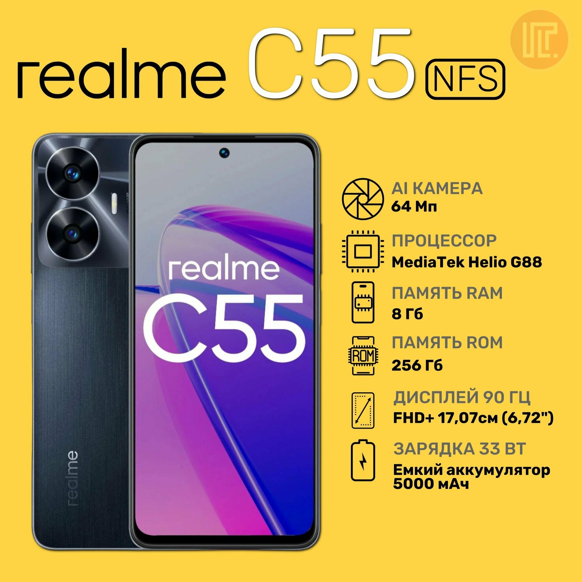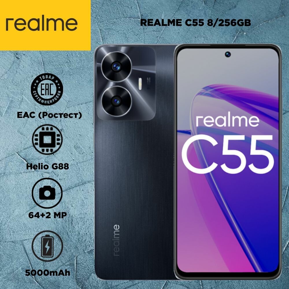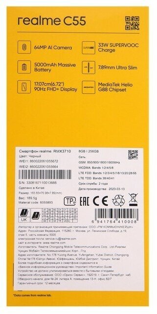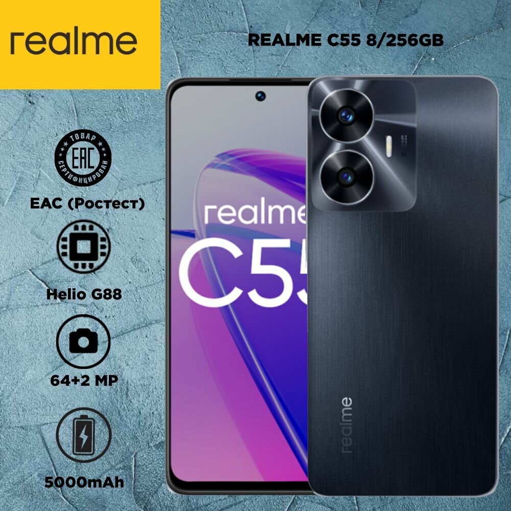 Описание Realme C55 8/256GB Чёрный Стильный смартфон с хорошей камерой, большим объемом памяти и быстрой зарядкой. Без проблем справляется с повседневными и игровыми задачами благодаря шустрому процессору. Тонкий и легкий, работает под управлением оболочки UI 4.0 на базе Android 13 и не вызовет трудностей с освоением. Сторонники классики оценят наличие стандартного разъема для наушников 3.5 мм. Стиль и комфорт Элегантный дизайн с многослойным градиентом на задней крышке выделяет смартфон Realme C55 среди конкурентов и заявляет об изысканном вкусе его владельца. Небольшой вес — менее 190 г и толщина менее 8 мм делают использование устройства удобным даже одной рукой, несмотря на большую диагональ экрана 6.72 дюйма. Частота обновления дисплея 90 Гц позволит получить четкую картинку без разрывов даже в динамичных сценах игр и фильмов, обеспечив комфорт для глаз. Плавная работа За быстродействие смартфона отвечают два процессора: центральный MediaTek Helio G88 и графический ARM Mali-G52. Они обеспечивают быструю обработку информации при запуске приложений, игр, создании и редактировании фотографий и видео. За одновременную работу без зависаний сразу нескольких программ отвечают 8 ГБ оперативной памяти, которую при необходимости можно увеличить за счет объема внутреннего хранилища. Емкость последнего — 256 ГБ. Хватит для установки десятков приложений, хранения сотен музыкальных треков и фотографий. Объем постоянной памяти можно расширить за счет использования SD-карты емкостью до 1 ТБ. Автономность и безопасность Емкость аккумулятора 5 000 мАч в совокупности с энергоэффективностью процессора обеспечит автономную работу смартфона на срок более суток. В комплекте блок питания на 33 Вт, который быстро восполнит запас энергии, если смартфон разрядился. Чтобы зарядить гаджет с 0 до 50 % через разъем Type-C, потребуется менее получаса. Предусмотрен ультраэкономный режим Ultra Saving Mode, продлевающий срок службы устройства при низком заряде. Датчик распознавания отпечатка пальца вмонтирован в кнопку блокировки на торце смартфона. Легкое касание клавиши мгновенно открывает доступ к функциям. Каждое мгновение запомнится Отдельного внимания заслуживает блок камер с разрешением основной 64 Мп. Сенсор увеличенного размера и интеллектуальные алгоритмы позволят получить фотографии высокой детализации с естественной цветопередачей. Даже сделанные в темноте кадры характеризуются достойными яркостью и контрастностью. Камера дополнена технологиями, позволяющими распознавать людей, автоматически наводить фокус, размывать задний план при необходимости. Можно создавать портреты, где объект остается цветным, а фон — черно-белым. Функция Dynamic Image Snapshot поможет повысить четкость фото, сделанных в движении. Фронтальная камера на 8 Мп подойдет для создания ярких портретов, а встроенные бьютификаторы позволят подчеркнуть индивидуальность. Важные дополнения Если текущей громкости динамика Realme C55 окажется недостаточно, то ее можно увеличить вдвое за счет технологии UltraBoom Speaker. Удачное расположение модуля бесконтактной оплаты NFC повысит точность считывания из любого положения при поднесении аппарата к терминалу. Сразу три слота для карт не потребуют выбирать между установкой двух SIM или карты памяти.