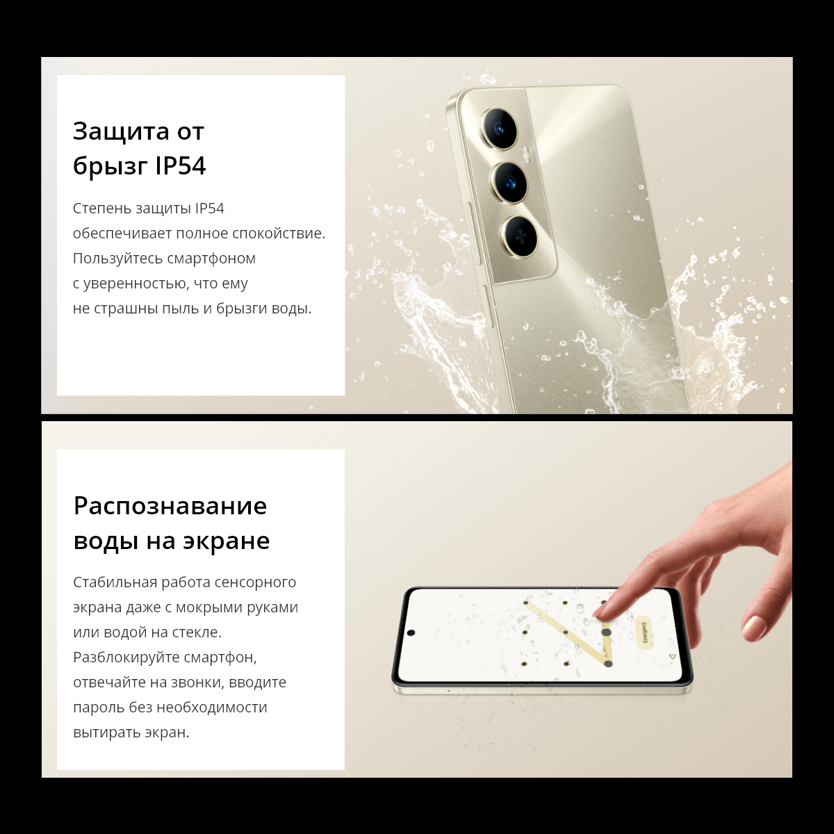 Мобильный отлично защищен от пыли и брызг воды благодаря прочному корпусу с рейтингом водонепроницаемости IP54.