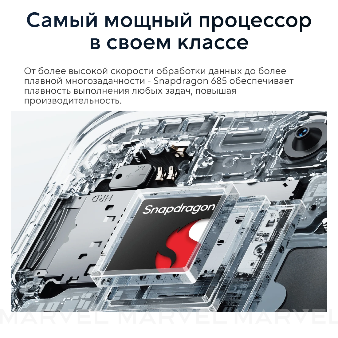Сотовый оснащен однокристальной системой Qualcomm Snapdragon 685, что обеспечивает высокую производительность и быструю работу. Батарея на 5000 мАч с поддержкой 33-ваттной проводной зарядки позволяет долго работать без подзарядки.