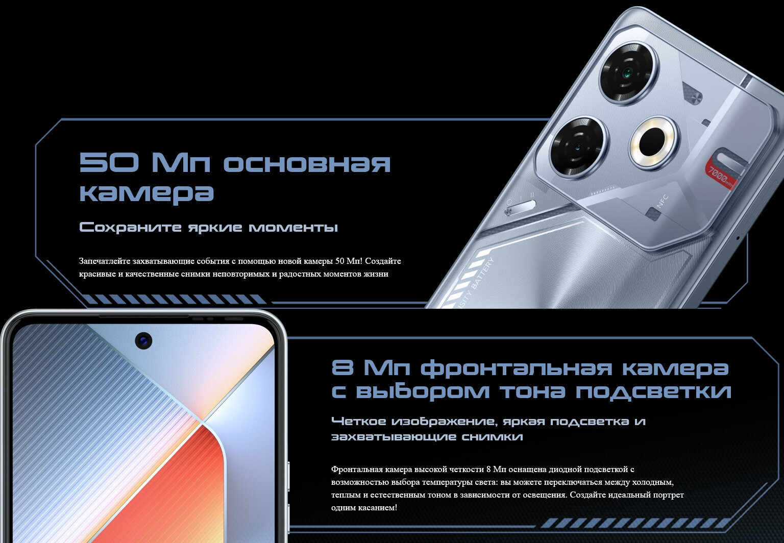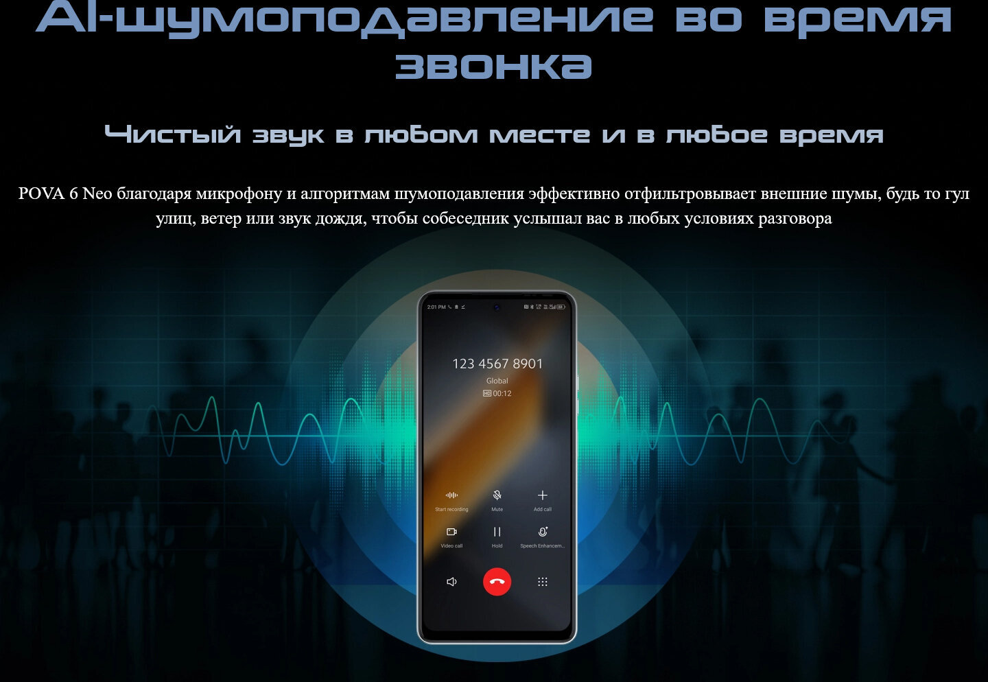 POVA 6 Neo Удивительная автономность и выбор режима зарядки Аккумулятор повышенной емкости дополнен зарядкой с несколькими режимами, работа которых продлевает срок службы батареи. - Аккумулятор 7000 мАч - Быстрая зарядка 33 Вт - 3 режима зарядки - Повышенная выносливость при 1% заряда - Заряжается при морозе до -10°C Еще больше удовольствия от игр и контента Широкий экран с высоким разрешением дополнен системой объемного звука DOLBY ATMOS, которая впервые появилась в смартфонах TECNO. Наслаждайтесь играми, кино, сериалами и любимыми ТВ-шоу. - Экран FHD+ с частотой 120 Гц - Объемный звук DOLBY ATMOS - 4D виброотклик Повышенная производительность при интенсивной нагрузке Современный процессор и большой объем памяти для безотказной работы в режиме многозадачности. - Процессор MediaTek G99 Ultimate - Память 256 + 16 Гб* (с учетом расширения ОЗУ) - Game Space 4.0 — отдельное пространство для комфортной игры Снимайте красивые фото и видео POVA 6 Neo поможет запечатлеть яркие и памятные моменты жизни в отличном качестве. - Основная камера 50 Мп - Фронтальная камера 8 Мп с выбором тона подсветки - Режим Super Night для качественных фото в условиях низкой освещенности Технологичный дизайн Эстетика научной фантастики, динамичные элементы и ярко-технологичный футуризм придутся по вкусу любителям цифровой вселенной и эры искусственного интеллекта. POVA 6 Neo выпускается в трех вариантах цветов: Чёрный астероид, Зелёная комета и Серебристый спутник.