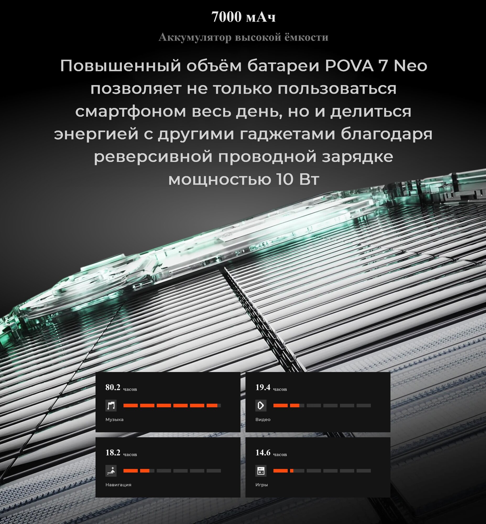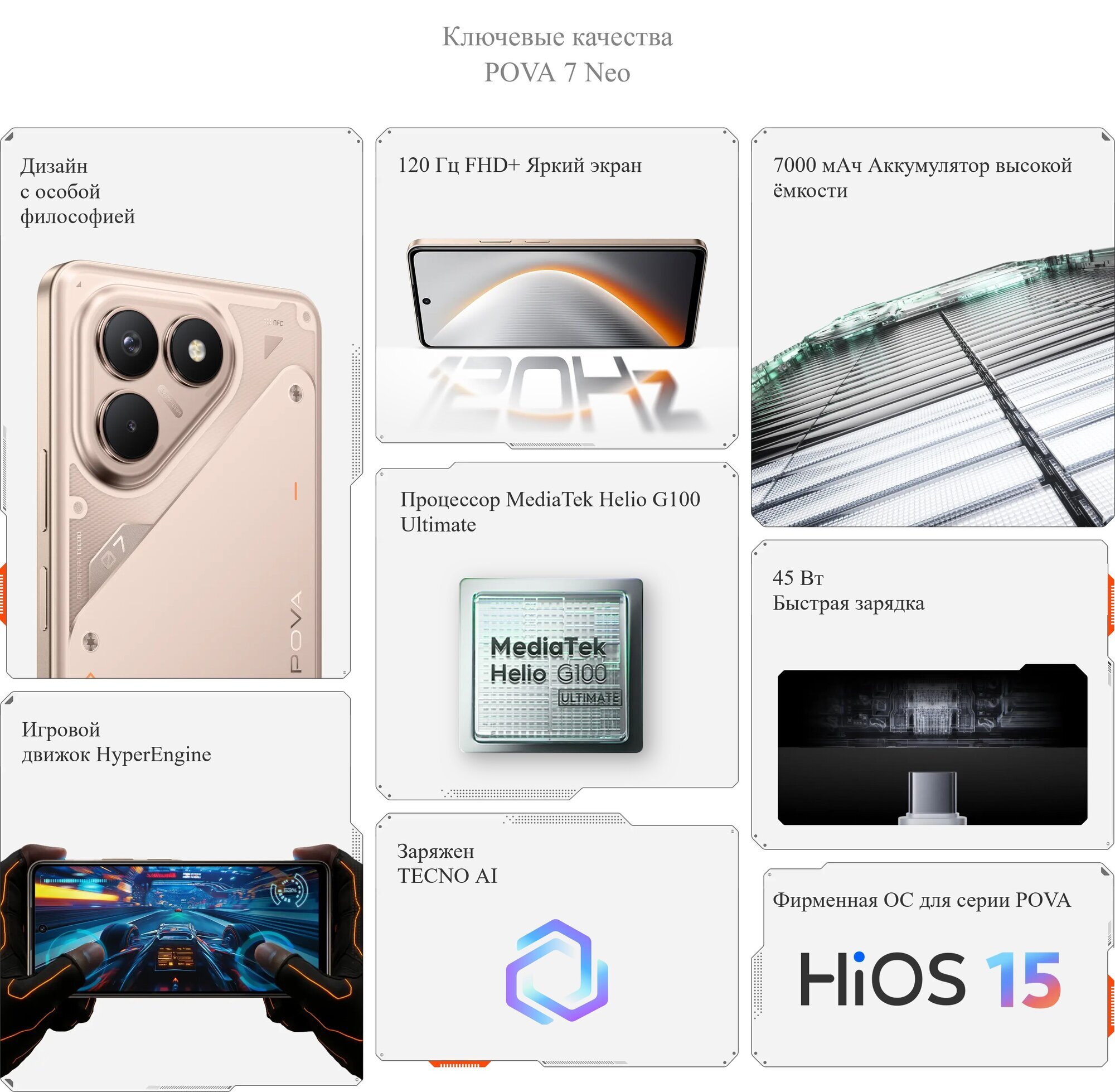 Смартфон TECNO POVA 7 Neo представляет собой сочетание функциональности и стиля. Он оснащен энергоэффективным аккумулятором на 7 000 мАч, что обеспечивает максимальную автономность и позволяет использовать его в течение всего дня.