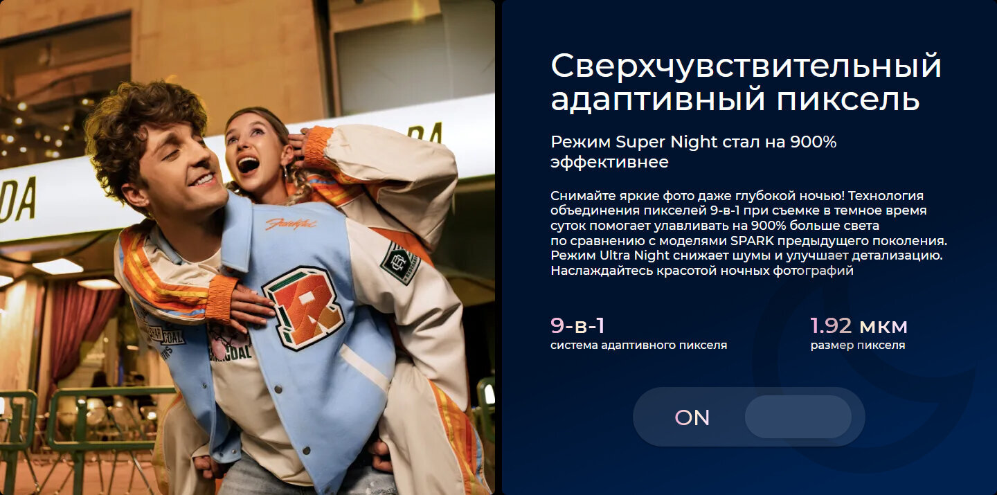 Основная камера со сверхчувствительностью 108 МпБеспрецедентная четкость изображения в истории SPARK Запечатлейте свой мир в эпических деталях с помощью 108-мегапиксельной сверхчувствительной камеры SPARK высочайшего разрешения - кругового объектива с флагманскими характеристиками, которые выводят фотографию на новый уровень. Четкость изображения как вблизи, так и вдалеке остается неизменной. 3-кратный встроенный сенсор и 10-кратный цифровой зум работают в сочетании, обеспечивая безупречную четкость изображения независимо от расстояния. Сверхбольшой сенсор 1/1.67 " и диафрагма F / 1.75 легко адаптируются к любому освещению. Яркий, с подсветкой или при слабом освещении - каждый кадр станет вашей изюминкой. Многокадровая технология HDR fusion уравновешивает свет и тень, превращая обычные по красоте композиции в экстраординарные снимки! Сверхчувствительный адаптивный пиксель на 900%Супер Ночной режимПочувствуйте силу света во тьме ночи. Сверхбольшой пиксель fusion размером от 0,64 мкм до колоссальных 1,92 мкм благодаря замечательной технологии 9-в-1 повышается светочувствительность, позволяя получать на 900% больше света для ночных снимков, чтобы ваша яркость просвечивала насквозь. Режим Ultra night усиливает его, уравновешивая шум и детали для получения превосходных снимков при слабом освещении. С наступлением темноты! SPARK помогает вашему зрению различать темноту. 32-Мегапиксельное Светящееся СелфиВладей ночью. Светись ярко!Будь там, и ты звезда! SPARK запечатлевает каждый твой блестящий момент с помощью захватывающей дух 32-мегапиксельной селфи-камеры с функцией восстановления портретов с помощью искусственного интеллекта и широкоугольным золотистым объективом 88,9 °. В одиночку или в окружении сохраняются все нюансы улыбки. Супер-вспышка светаНе просто свет. У него есть разум.Селфи получаются с легкостью даже в темноте! В то время как двухцветная вспышка делает фон ярче, алгоритм Super Flash точно накладывает 8 кадров экспозиции, чтобы создать именно тот прожектор, который вам нужен! Физическая заливка света + тонкая настройка с помощью искусственного интеллекта, результатом являются ваши лестные фотографии со сбалансированной яркостью в любое время и в любом месте. Попрощайтесь с чрезмерной или недостаточной экспозицией. Каждый снимок - это великолепный подарок! Двойное видеоСпереди и сзади никогда не бывает недостатка в вдохновении!Активируйте как переднюю, так и заднюю камеры; Расширьте возможности для творчества! Эта захватывающая интерактивная функция открывает перед вами целый мир возможностей для воплощения ваших видео идей! Качество видео SPARK вышло на новый уровень Переживите свои эпические моменты с четкостью изображения 2K - с новыми открытиями при каждом воспроизведении! Фон естественным образом размывается, поэтому ваш герой выделяется; Ночной алгоритм максимально снижает уровень шума, превращая тусклые сцены в яркие сказки. Оцените потрясающие моменты в мельчайших деталях, которые невозможно уловить с помощью орлиного взгляда SPARK! Дизайн в стиле деко от ЭйлераКосмический опыт, доступный под рукойМинималистичная эстетика сочетается с футуристическим дизайном SPARK с тремя кольцами cosmic. Гладкие металлические грани сочетаются с космическим декором, вдохновленным звездами. Тонкая гравировка и вспышка в форме лепестка подчеркивают 