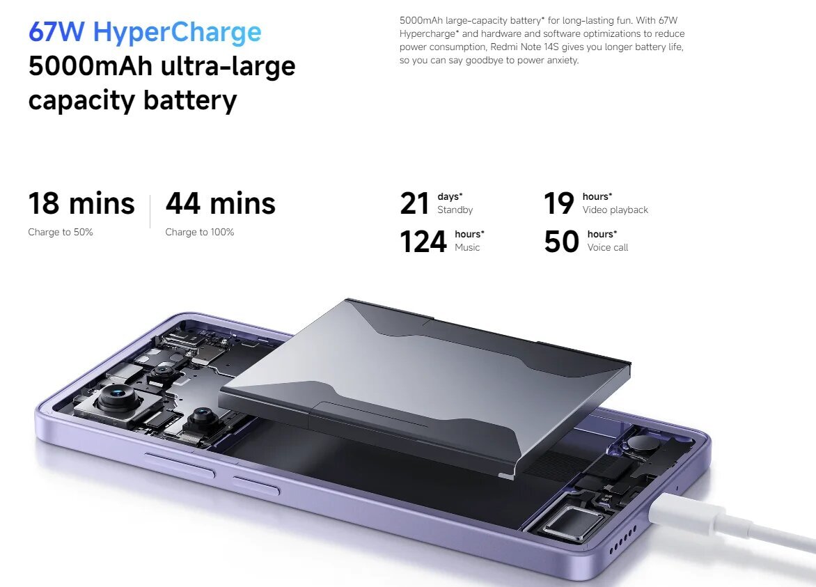 Смартфон Xiaomi Redmi Note 14S 8/128 ГБ оснащен двумя слотами для SIM-карт, что позволяет использовать два номера на одном устройстве. В комплекте с смартфоном идут адаптер, кабель USB Type-C, инструмент для извлечения SIM-карты, защитный чехол и документация.