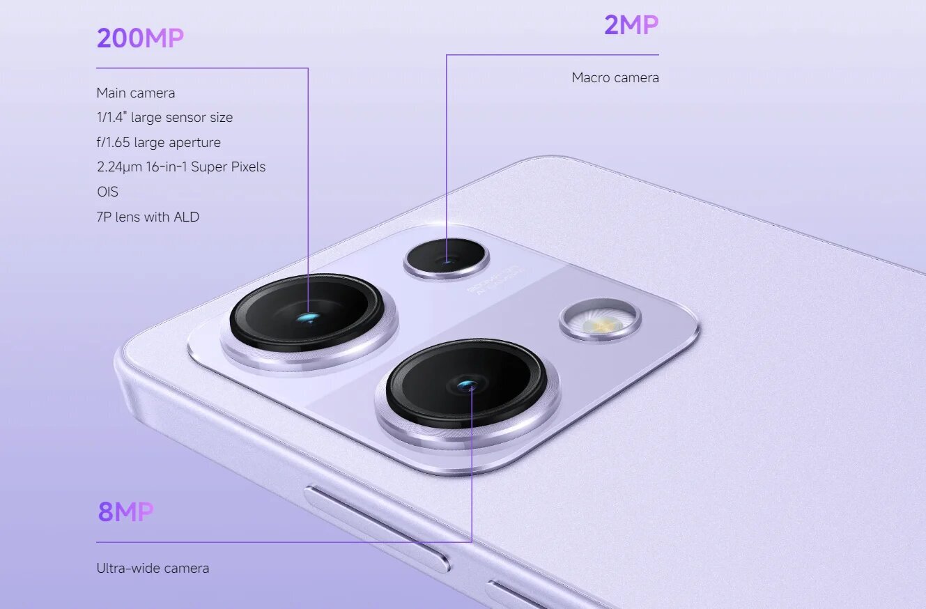Смартфон оснащен тремя объективами основной камеры с разрешением 200 МП, 8 МП и 2 МП, что, вероятно, обеспечивает отличные возможности для фотосъемки в различных условиях. Фронтальная камера на 16 МП подходит для качественных селфи и видеосвязи.